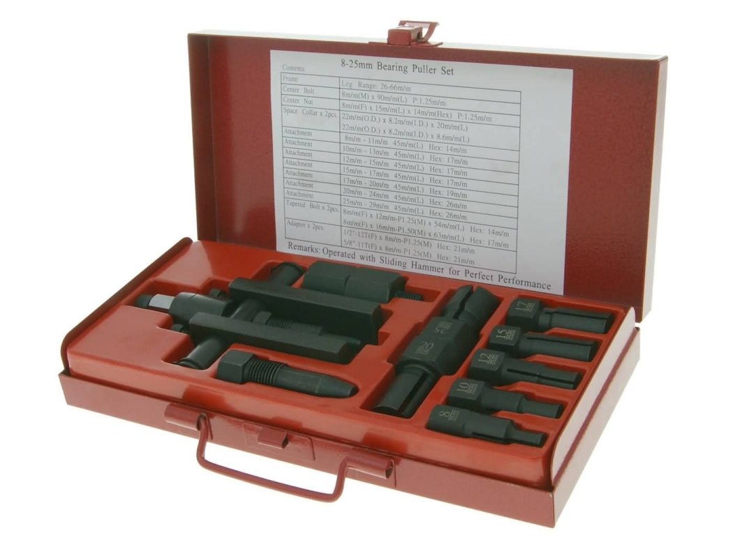 Ulosvedinsarja laakerien irroitukseen. Tartuntaleveys 26-66mm. Sisältää koot sisämitaltaan 8-25mm, 7 eri kokoa.