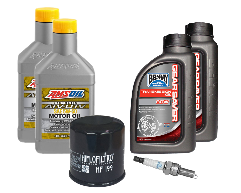Huoltopaketti mönkijällesi. Paketti sisältää moottoriöljyn, öljynsuodattimen, sytytystulpan ja peräöljyt.